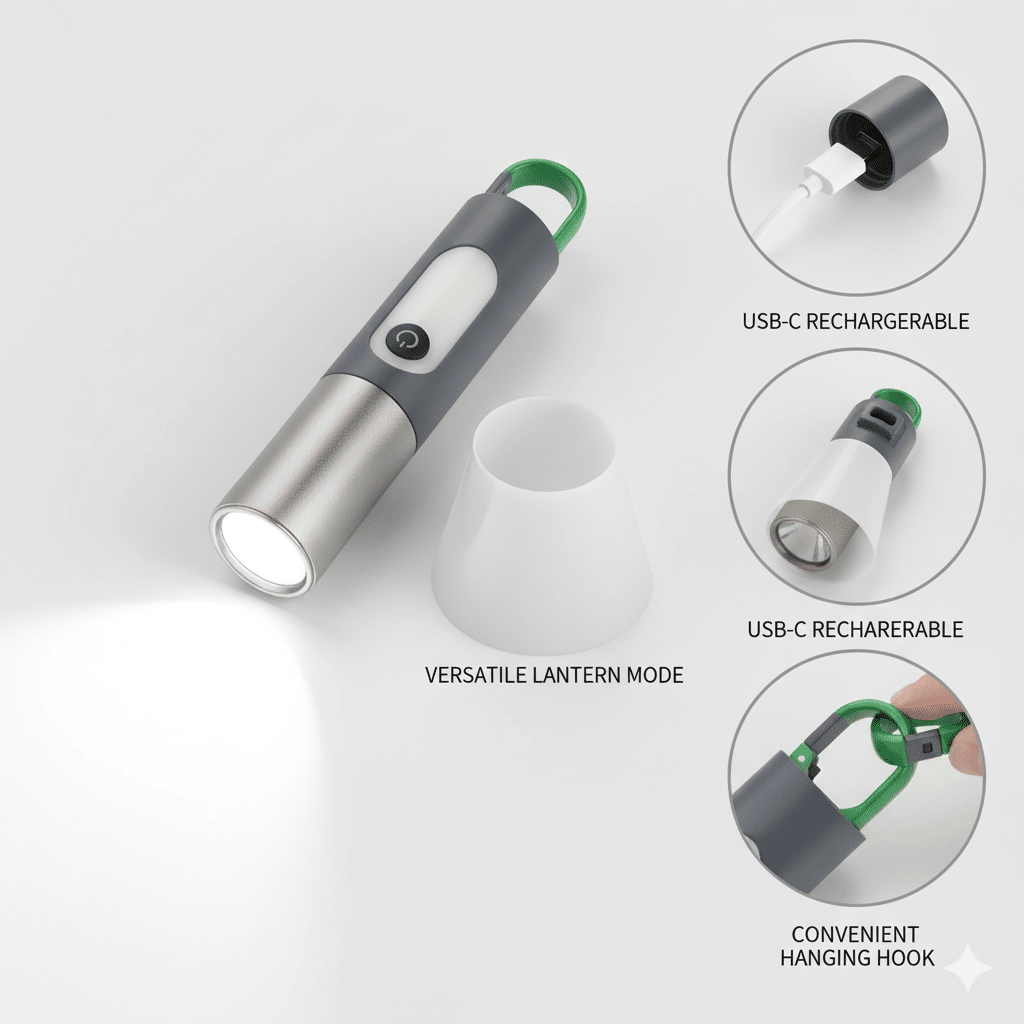 Its USB Type-C rechargeable battery and waterproof IPX4 rating make it reliable in all conditions. With multiple modes and zoomable focus, this flashlight works as a torch, lantern, and keychain light in one.