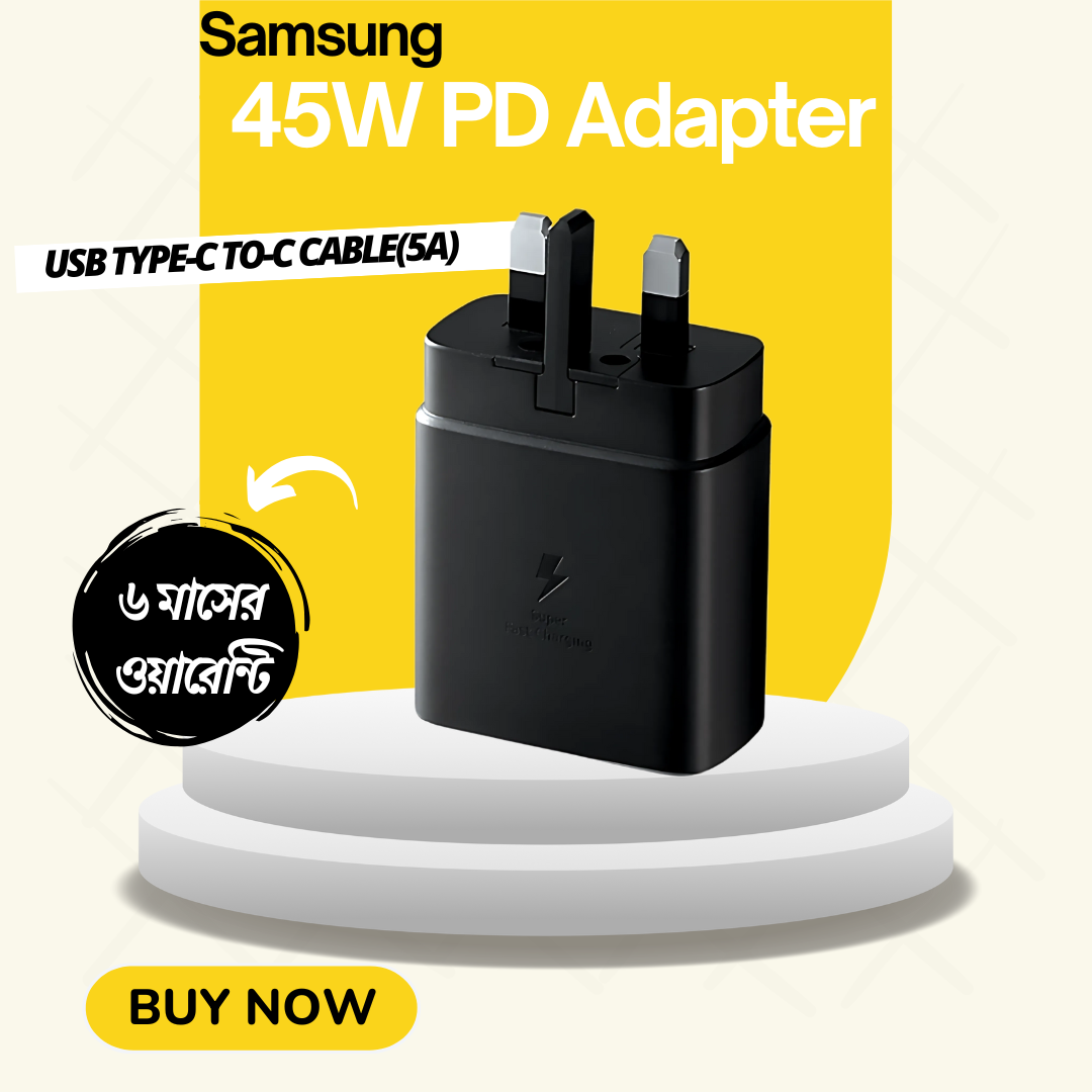The Samsung 45W 5A USB-C Power Adapter with Cable is the perfect travel companion for powering up your devices quickly and safely. With 45W Super-Fast Charging (PD), it delivers up to 3X faster charging compared to standard adapters, ensuring your Galaxy devices, tablets, and accessories are always ready to use.
